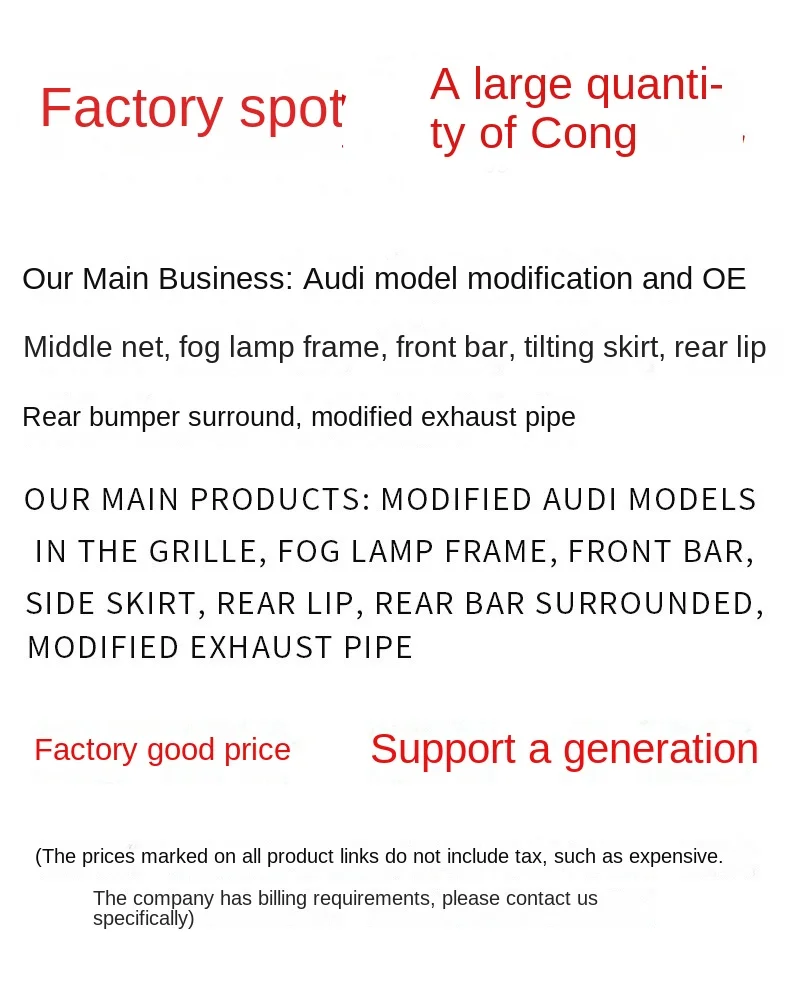 Guangzhou Jiayi Automobile Trading Co., Ltd. is an enterprise specializing in providing appearance parts for Volkswagen Audi. For more than 20 years, it has focused on the R & D and production of appearance parts for Volkswagen Audi. With the purpose of integrity, quality and service, it is an enterprise integrating industry and trade.